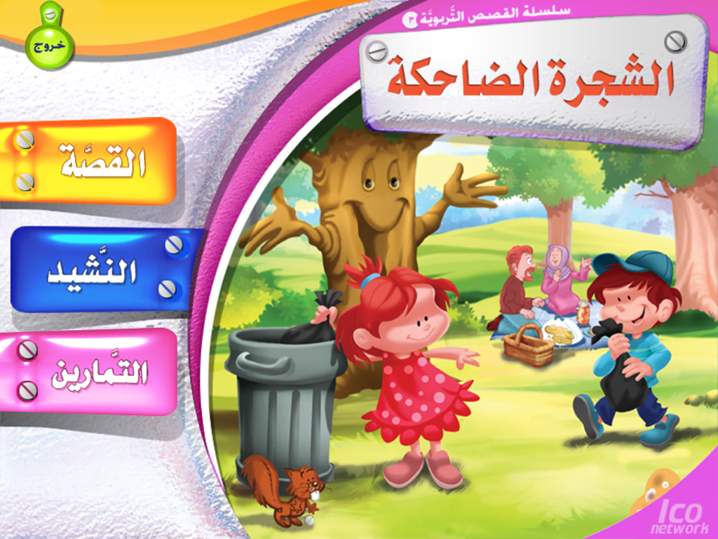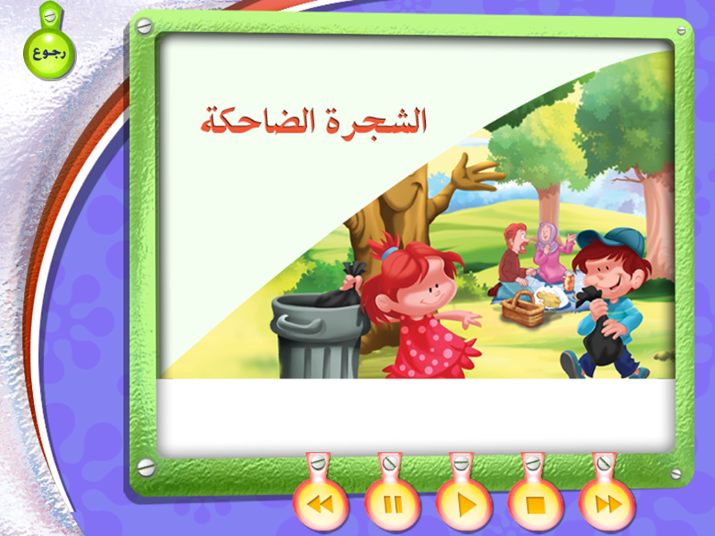 الأهداف : الاهتمام بالنظافة والبيئة الخصائص: تضمن مجموعة من الألعاب اللغوية مثل (التلوين ،التوصيل ، الذاكرة، البازل، تجميع الصور) وتتضمن ايضا أنشودة مسجلة بصوت أطفال (كورال ) تُعبر عن مضمون ومحتوى القصة |