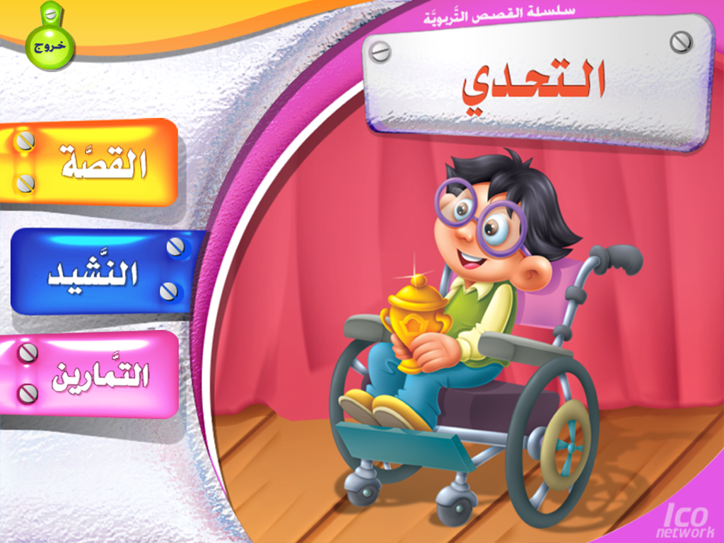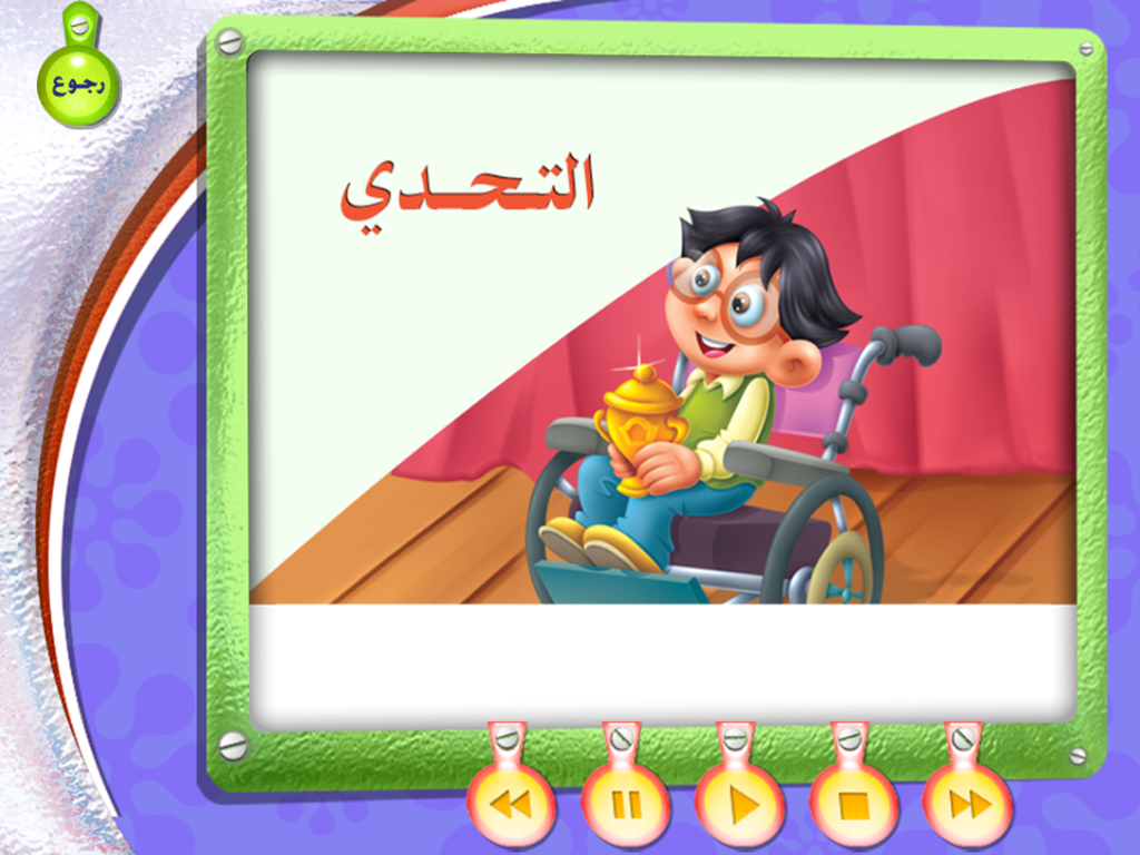 الأهداف :* تنمية الإرادة والتحدي على النجاح والتفوق. الخصائص: تضمن مجموعة من الألعاب اللغوية مثل (التلوين ،التوصيل ، الذاكرة، البازل، تجميع الصور) وتتضمن ايضا أنشودة مسجلة بصوت أطفال (كورال ) تُعبر عن مضمون ومحتوى القصة |